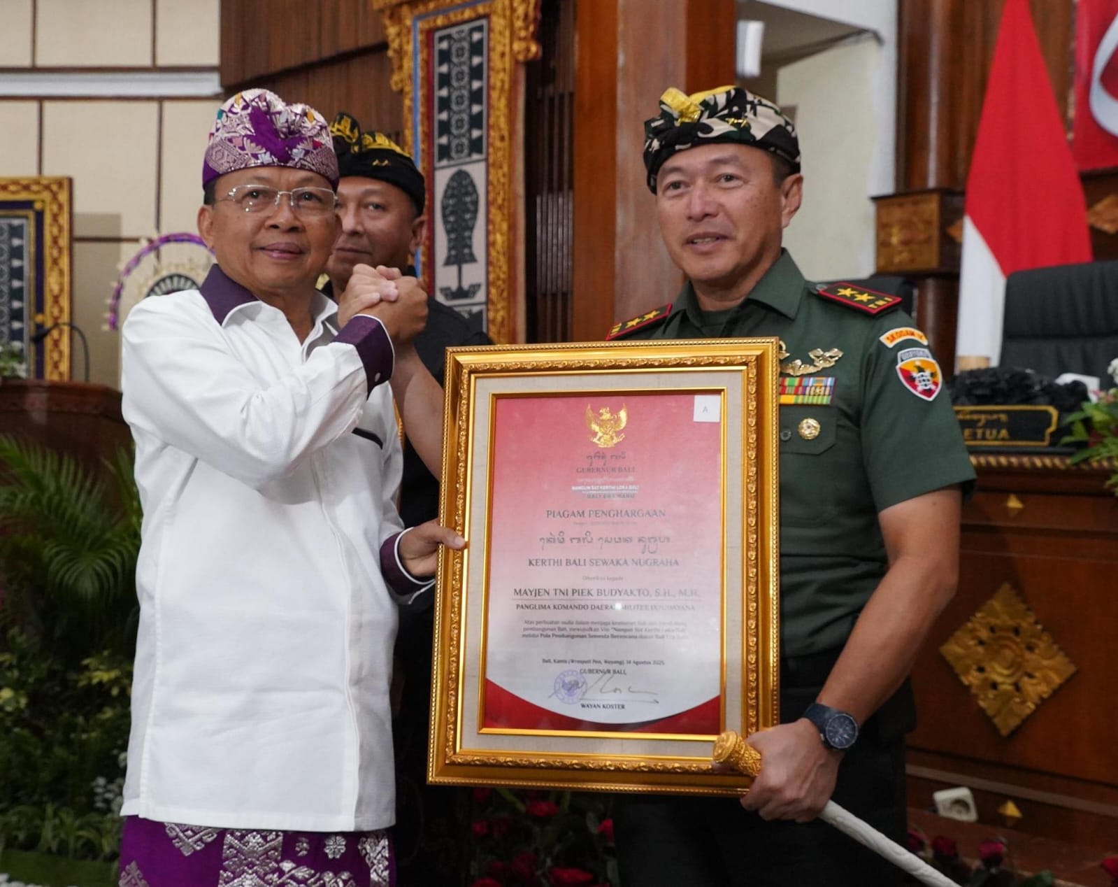Denpasar, IndoNews8| Pangdam IX/Udayana, Mayjen TNI Piek Budyakto, menerima penghargaan bergengsi Kerthi Bali Sewaka Nugraha dari Pemerintah Provinsi Bali. Penghargaan tersebut diserahkan langsung oleh Gubernur Bali, Dr. Wayan Koster, pada acara Rapat Paripurna ke-34 dan ke-35 DPRD Provinsi Bali Masa Persidangan III Tahun Sidang 2024–2025, yang berlangsung di Ruang Rapat Wisma Sabha Utama, Kantor Gubernur Bali, Jalan Basuki Rahmat, Banjar Sembung Sari, Denpasar. Pada Kamis 14 Agustus 2025.